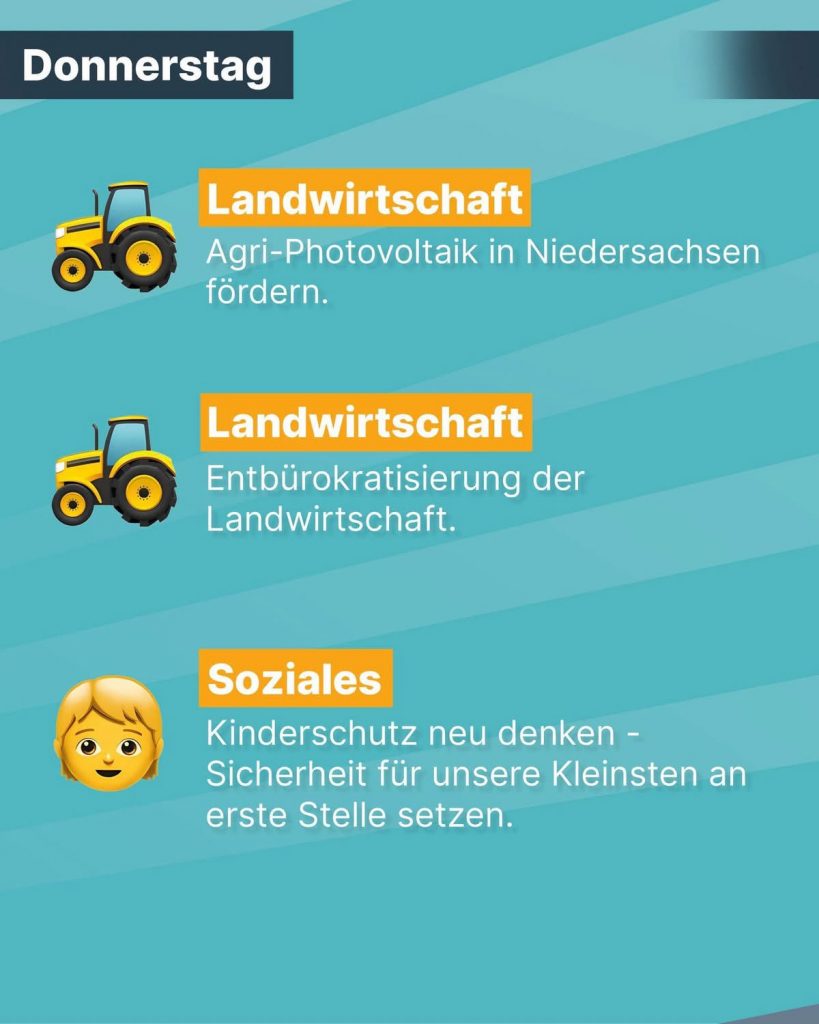 Wir als CDU-Kreisverband schauen mit großem Interesse nach Hannover und verfolgen die Debatten aufmerksam. Es ist wichtig, dass die richtigen Weichen für eine verlässliche Finanzpolitik, starke Kommunen, die Sicherheit unserer Bürgerinnen und Bürger und eine zukunftsfähige Entwicklung Niedersachsens gestellt werden.
