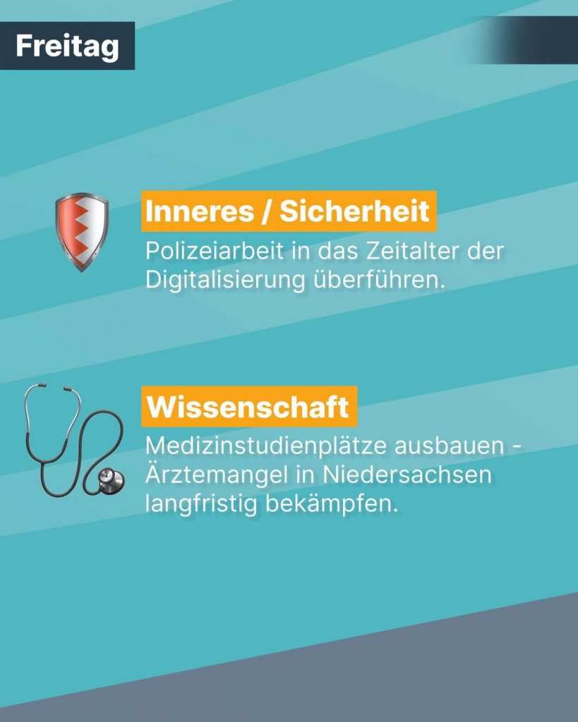 • sowie Zukunftsthemen wie digitale Polizeiarbeit und zusätzliche Medizinstudienplätze.