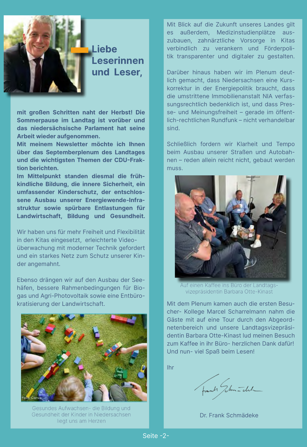 Mit seinem aktuellen Newsletter möchte unser Landtagsabgeordneter Dr. Frank Schmädeke Ihnen spannende Einblicke in die Arbeit des Niedersächsischen Landtages geben. Die Sommerpause ist vorbei – und es gibt viele wichtige Themen, die uns in Niedersachsen bewegen: